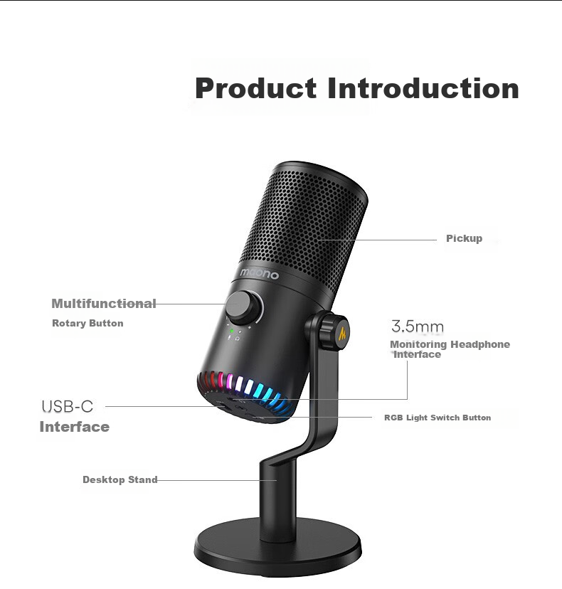 **Package Contents:** Microphone, multi-functional knob, 3.5mm headphone jack, USB-C interface, RGB lighting switch button, desktop stand