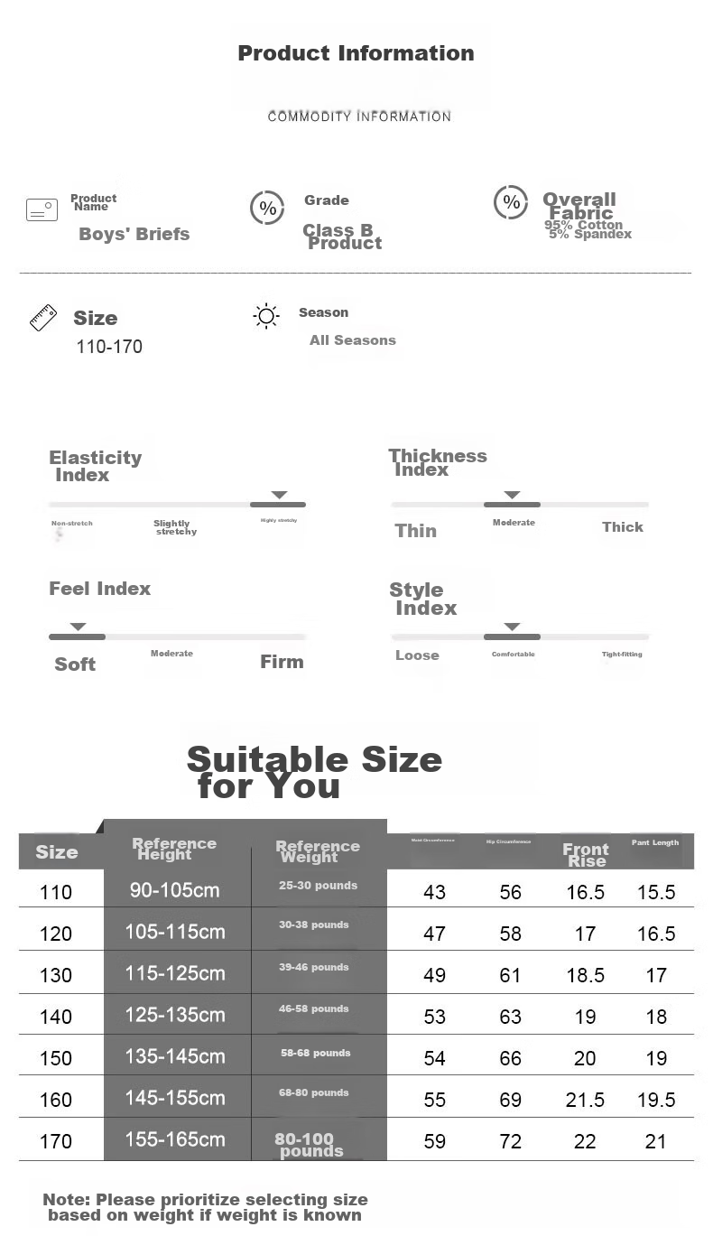 - 110: 90-105cm, 25-30kg, 43cm waist, 56cm hip, 16.5cm front rise, 15.5cm inseam