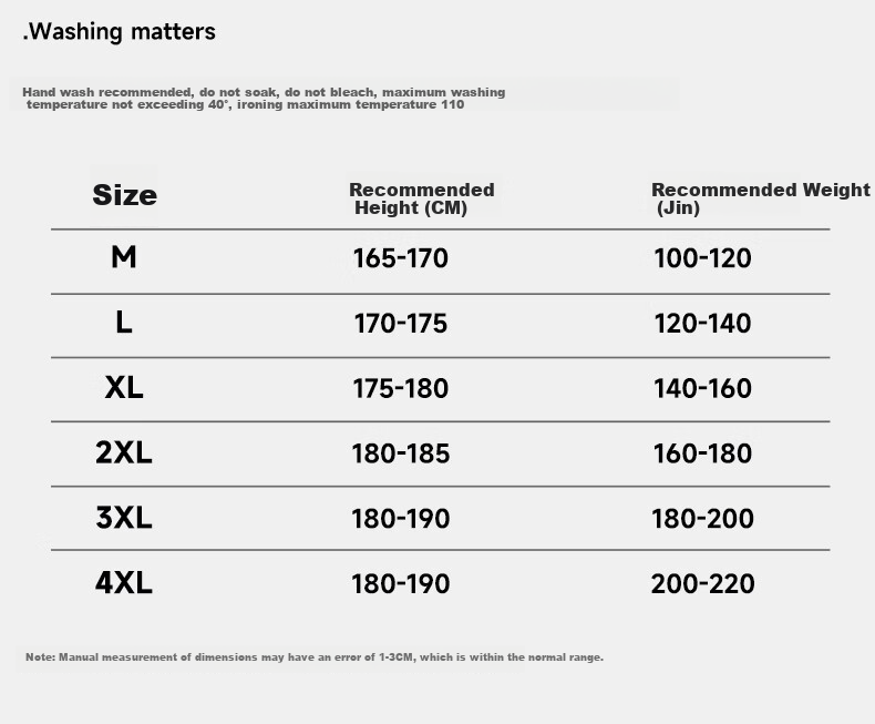 - 3XL: Height 180-190cm, Weight 180-200lbs