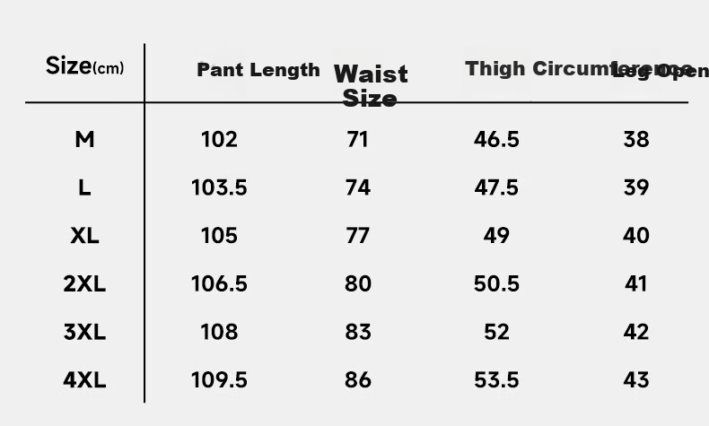 - 3XL: Length 108, Waist 83, Thigh 52, Hem 42