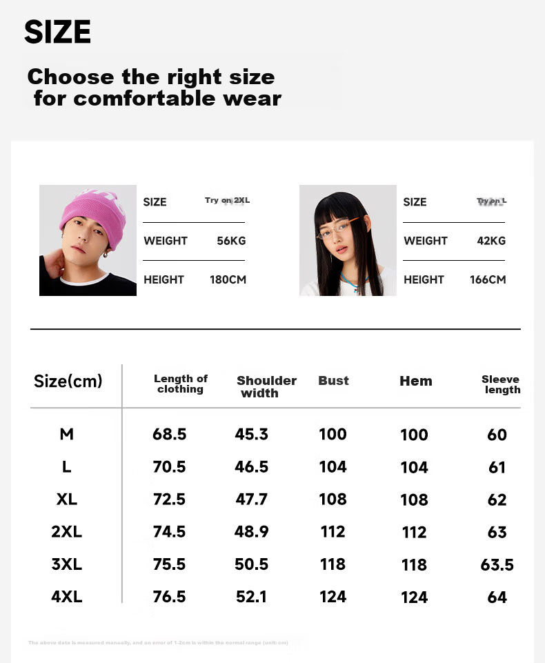 - XL: Length 72.5, Shoulder 47.7, Chest 108, Hem 108, Sleeve 62