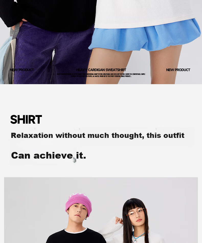 Layout: Structured and soft, round neck design, classic and comfortable, dropped shoulder design, loose fit, reinforced hem, straight cuffs, double-stitched for durability