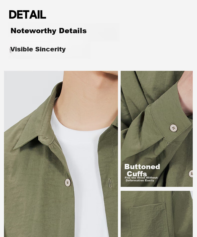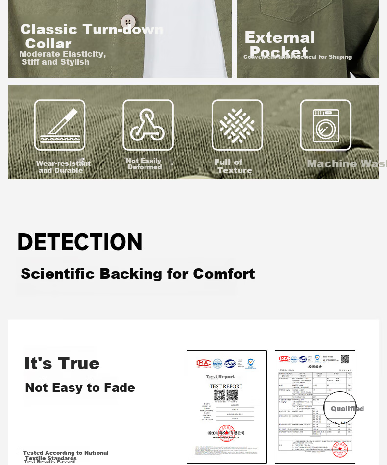 **Details:** Buttoned cuffs, classic collar, external pockets, durable and stylish