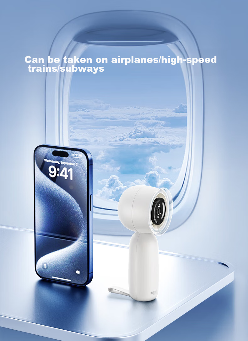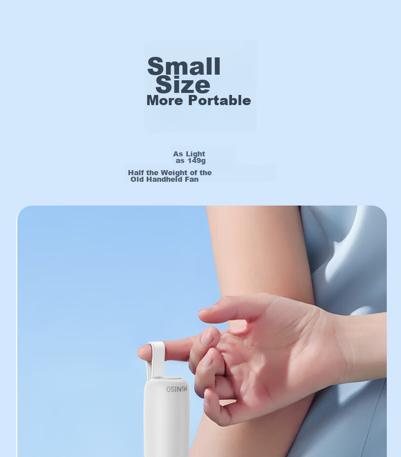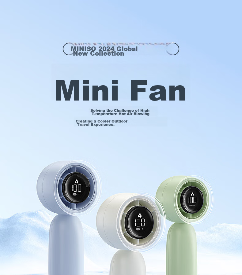 **Description:** MINISO's latest global model for 2024, the Mini Portable Fan, designed to tackle high temperatures and provide a cooler outdoor experience.