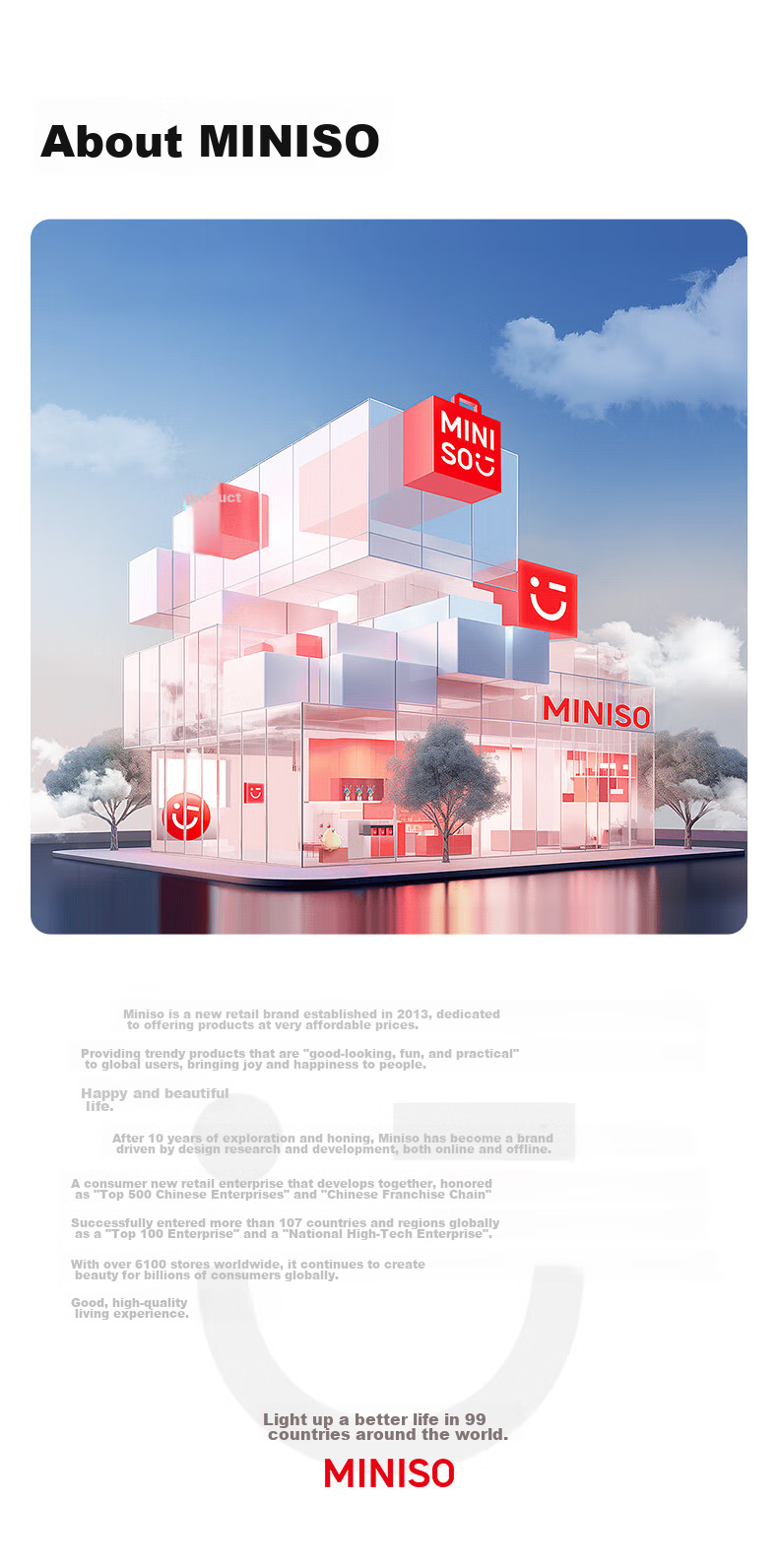 - Recognized as one of China's Top 500 Enterprises, Top 100 Franchise Enterprises, and a National High-Tech Enterprise, MINISO continues to create high-quality lifestyle experiences for billions of consumers worldwide, illuminating a better life in 99 countries.