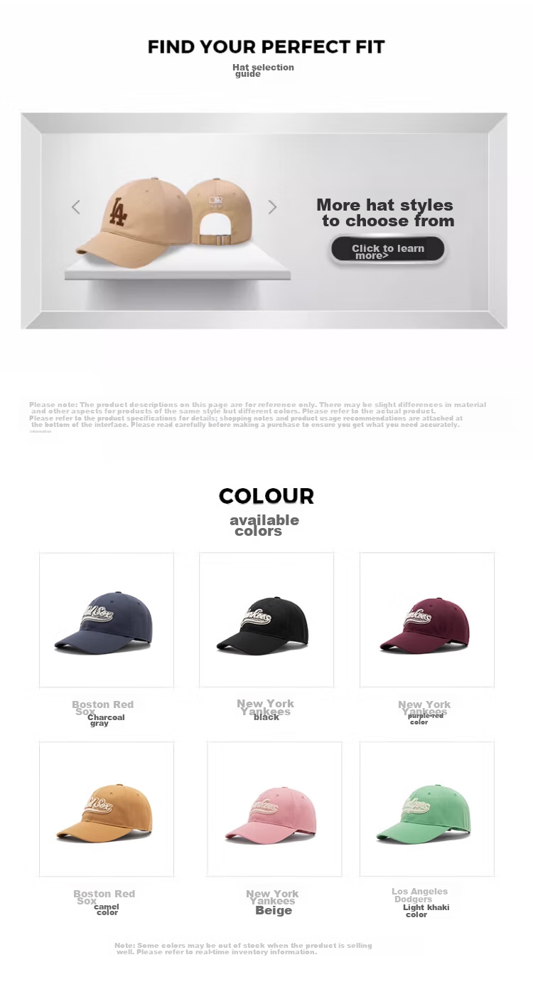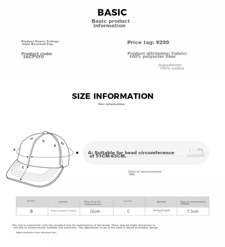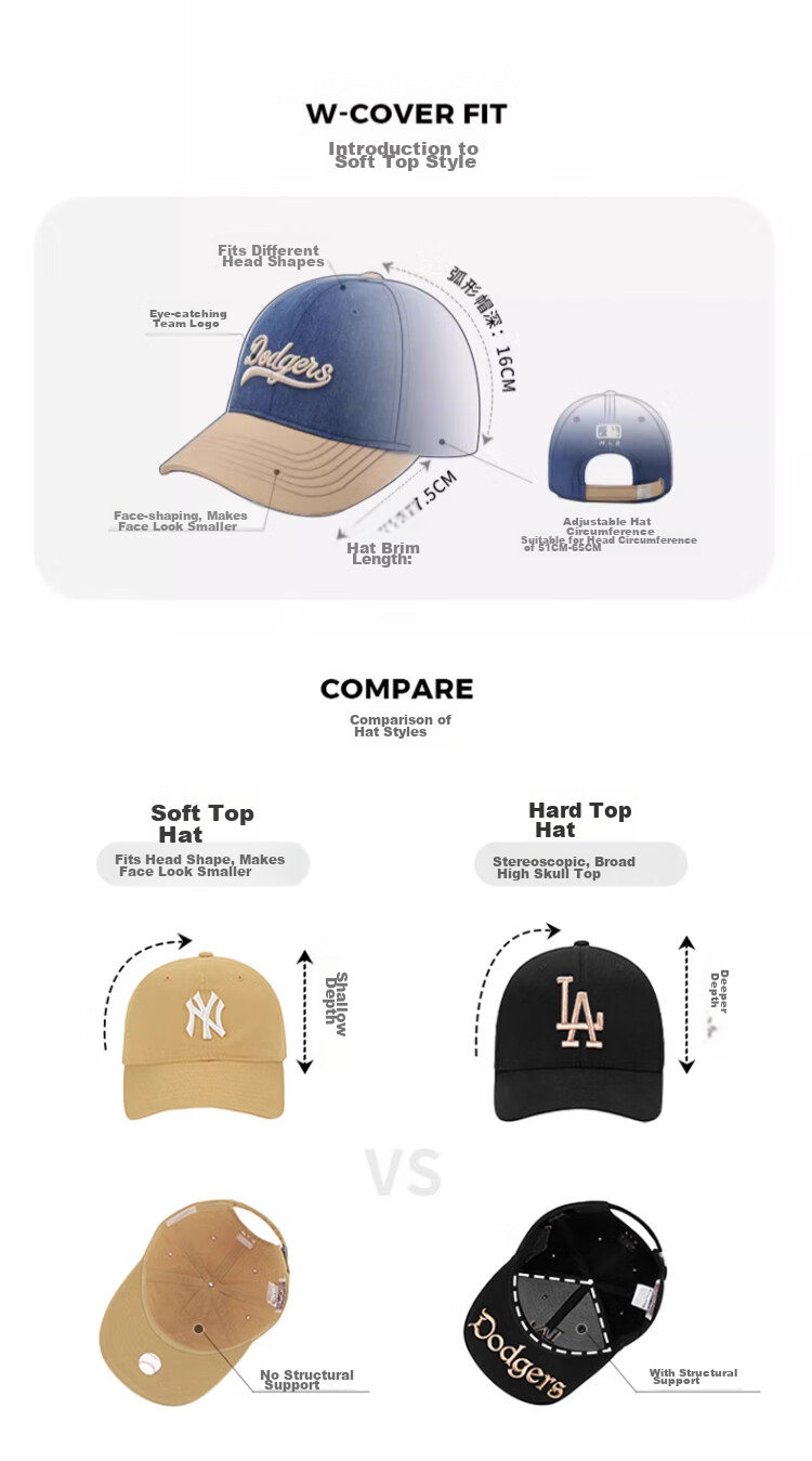 - Soft top cap vs. Hard top cap: Soft top cap fits head shape better, enhances facial features, 7.5cm brim length, adjustable head circumference.