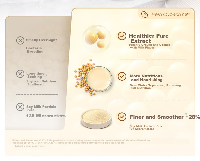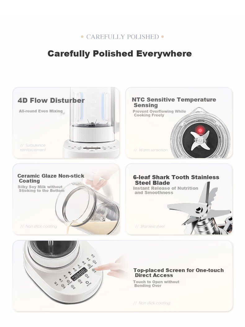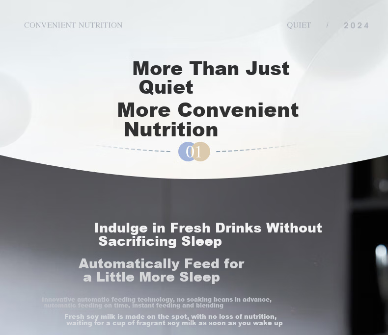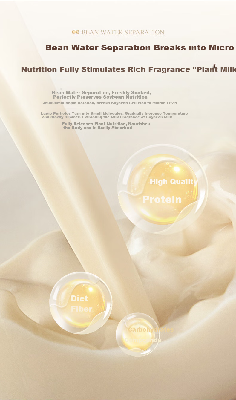 **Nutrition:** Convenient and quiet operation, automatic feeding technology, bean-water separation for fresh soy milk