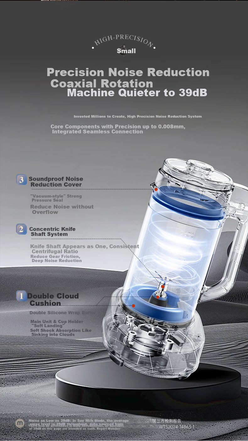 **Noise Reduction System:** Precision components with high precision of 0.008mm, dual cloud cushion for noise reduction, noise level reduced to 39dB