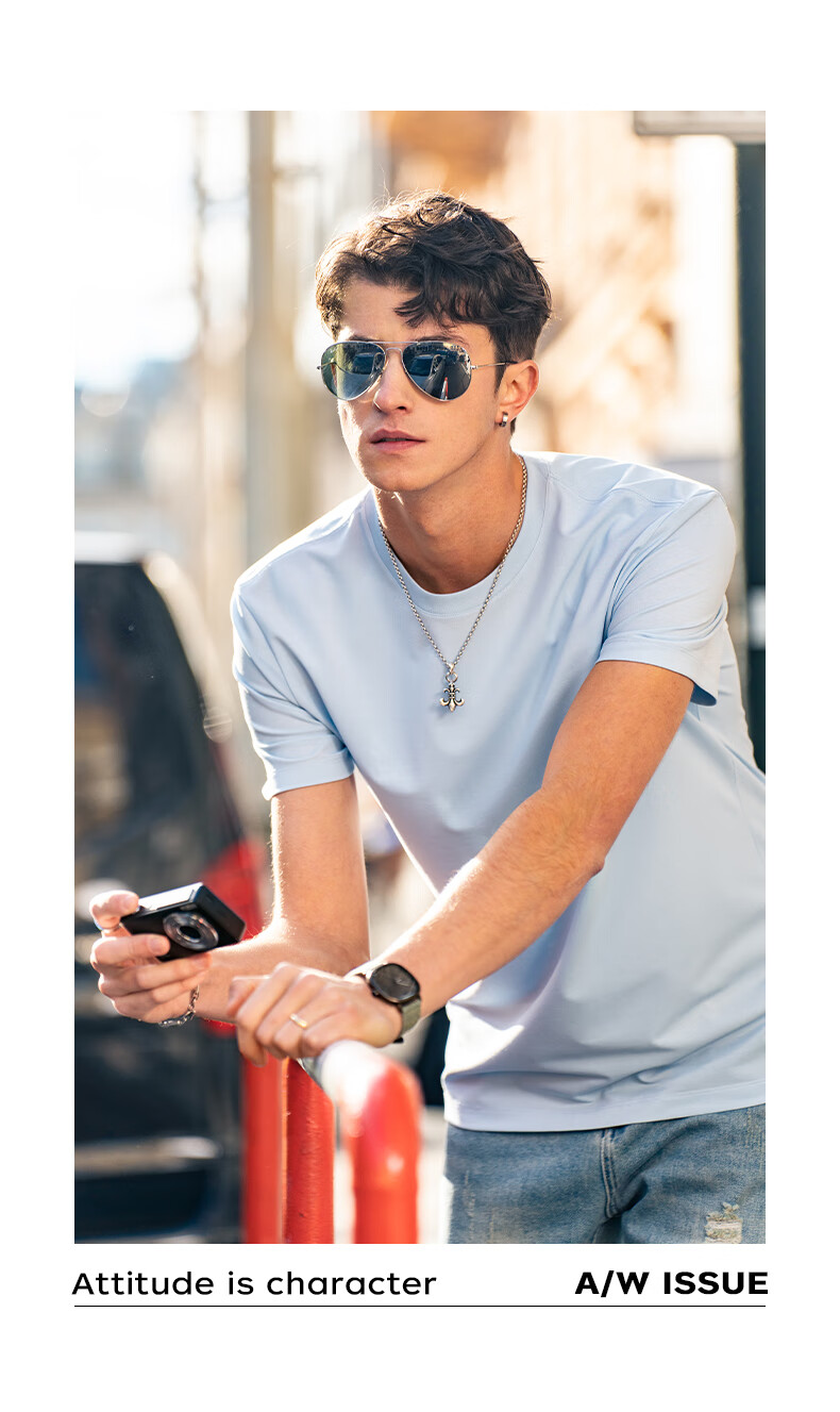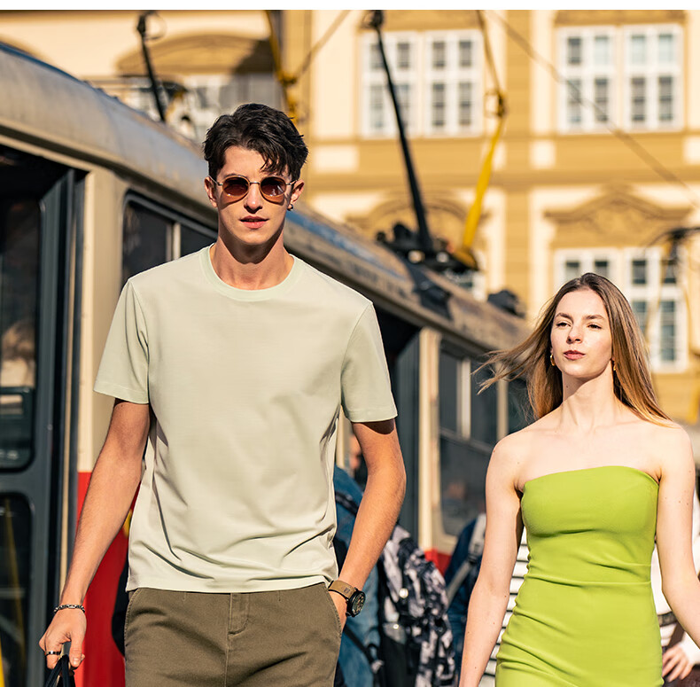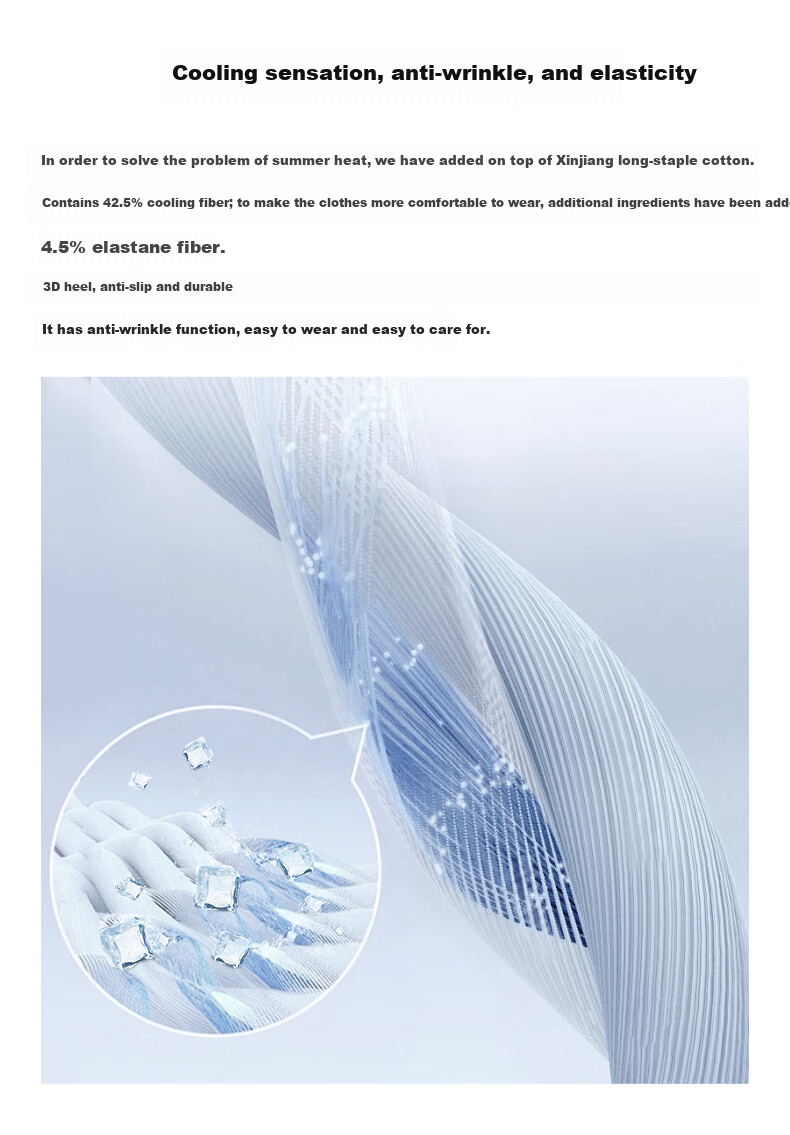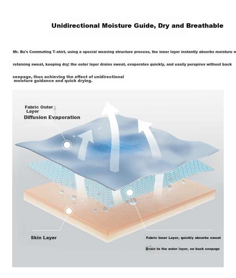 **Fabric Technology:** The Commuter T utilizes a special weaving structure that instantly absorbs moisture on the inner layer to keep dry and quickly evaporates sweat on the outer layer, achieving a unidirectional moisture-wicking and quick-drying effect. The fabric disperses heat and moisture efficiently, with the inner layer rapidly absorbing sweat and transferring it to the outer layer without seepage. The addition of 42.5% cooling fiber and 4.5% elastic silk on top of the Xinjiang long-staple cotton base provides a cooling sensation, wrinkle resistance, and elasticity for enhanced comfort and easy care.
