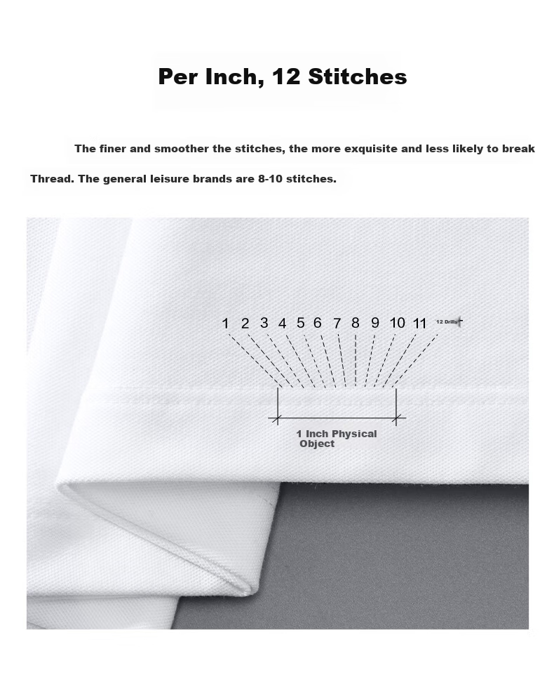 **Stitching:** Each inch contains 12 stitches for a delicate and durable finish. The use of double stitching and 0.3 double-needle pressure lines ensures a neat and refined look on the cuffs and shoulders, providing a sharp appearance when worn alone.