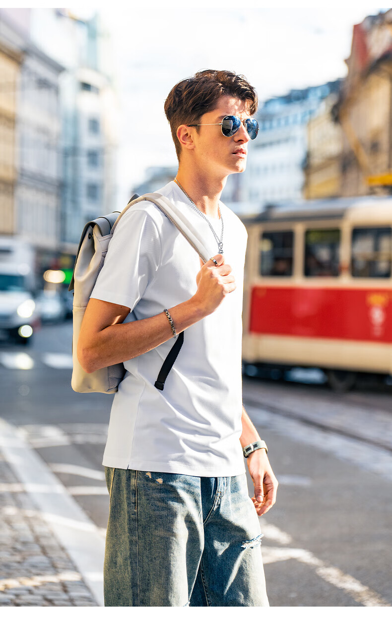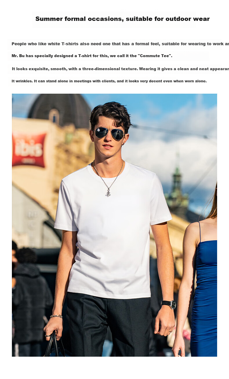 **Description:** A specially designed T-shirt for formal occasions in the summer, suitable for outdoor wear. Ideal for individuals who prefer white T-shirts and need a formal yet comfortable option for work commutes. The Commuter T by MrBu features a refined and smooth appearance with a three-dimensional texture. It maintains a clean and wrinkle-free look when worn, suitable for meetings and client interactions. The fabric is unidirectionally moisture-wicking, ensuring dryness and breathability.