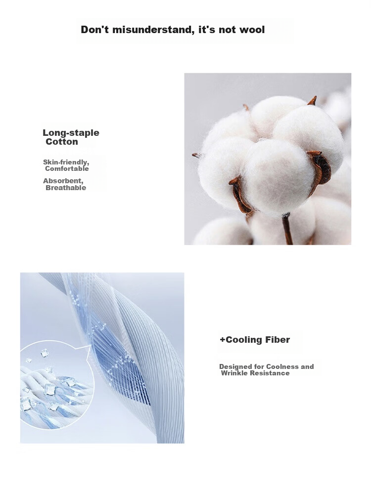 Fabric: Long-staple cotton, skin-friendly, breathable, moisture-wicking, with cooling fibers for a cool and wrinkle-resistant feel