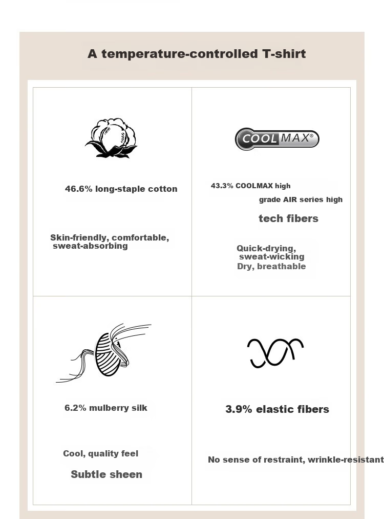 **Features:** COOLMAX technology for temperature control, breathable and quick-drying fabric, mulberry silk for coolness, spandex for elasticity