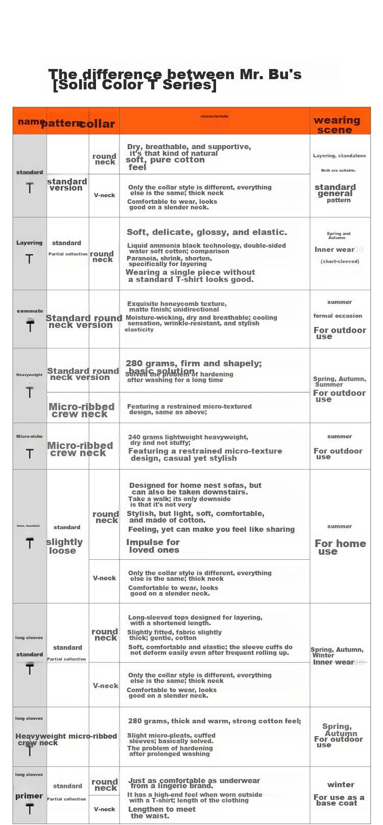- **Name:** Standard, V-neck, Liquid Ammonia Black Technology, Micro-profile, etc.