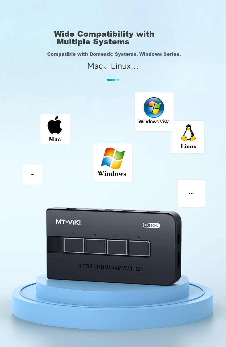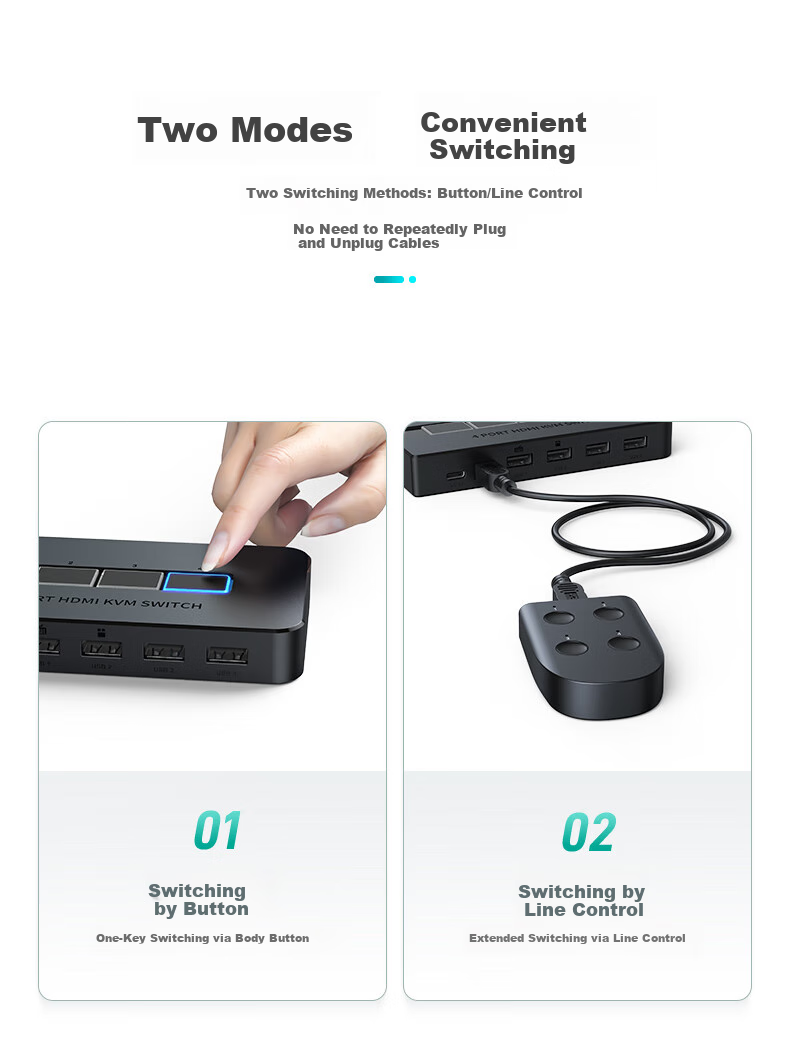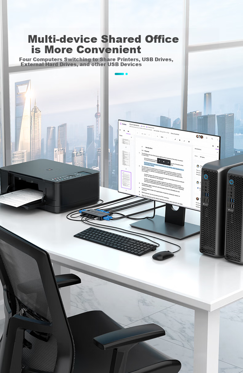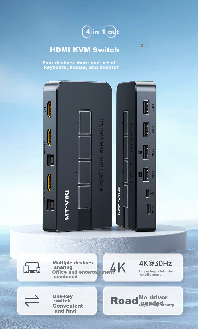 - Allows four devices to share one set of keyboard, mouse, and monitor