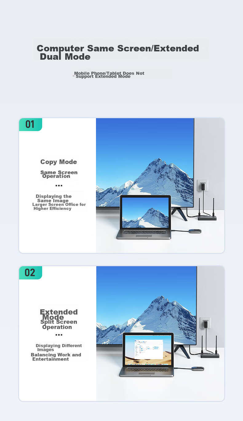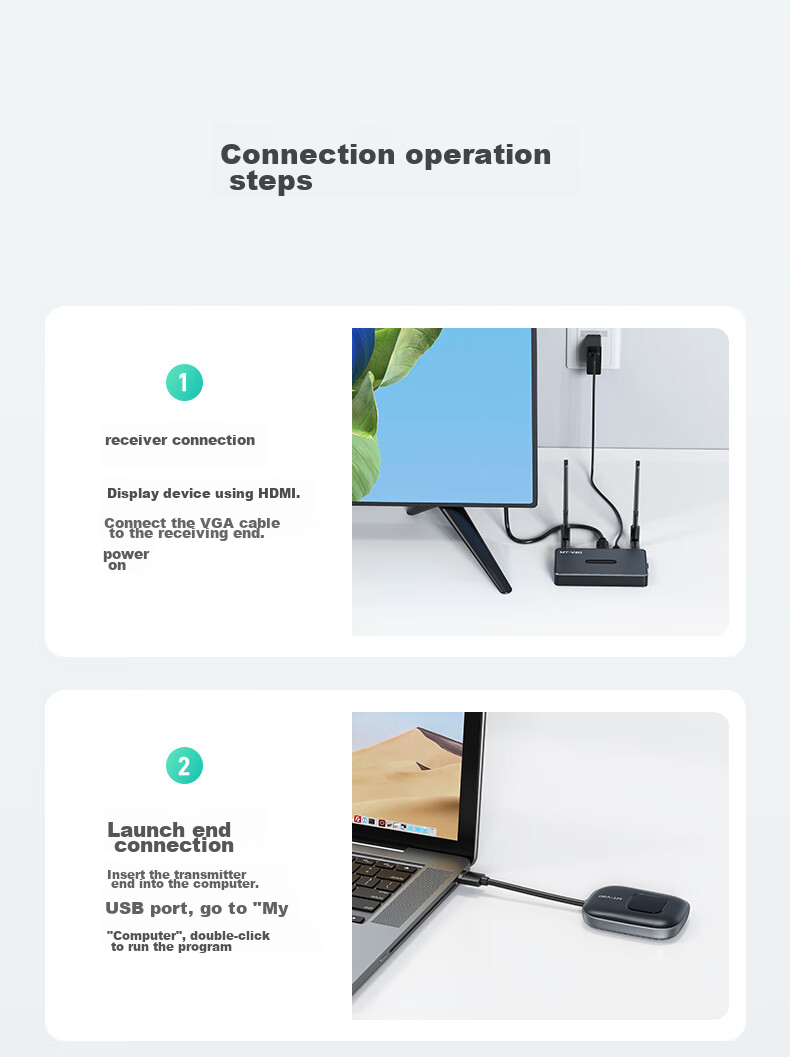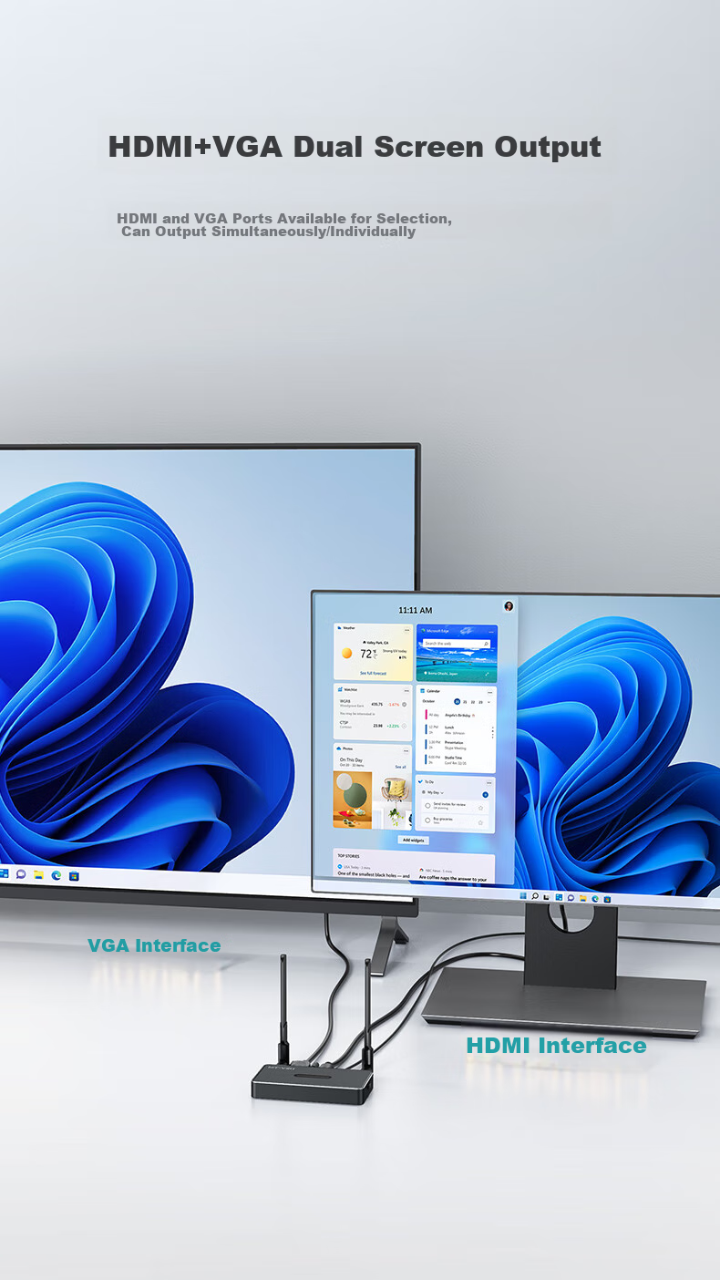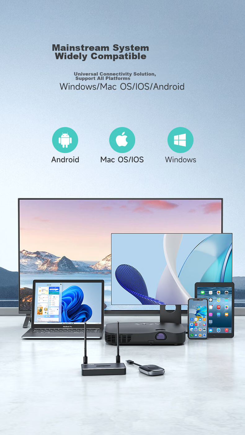 Supports screen mirroring from laptops/desktops to HDMI/VGA interface TVs/displays/projectors
