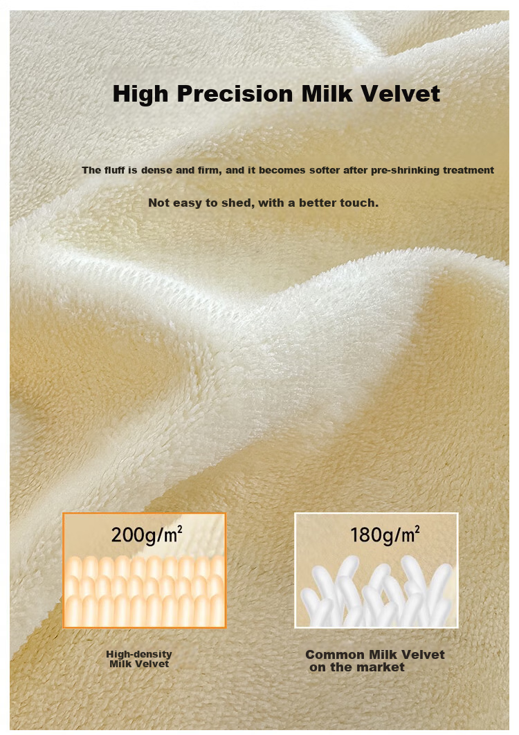 Fabric Weight: 200g/m² (milk velvet), 180g/m² (high-density milk velvet), 180g/m² (regular milk velvet)