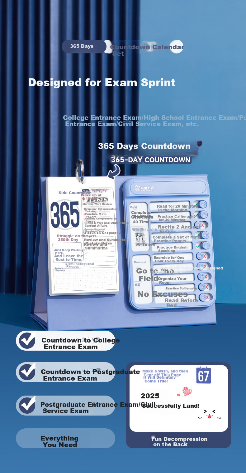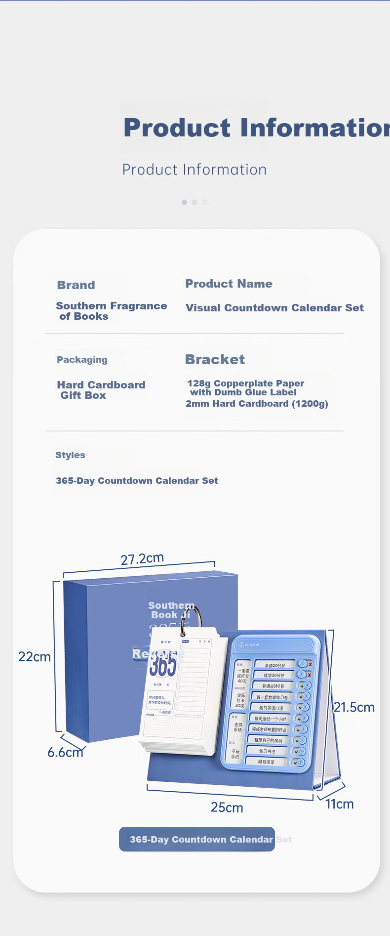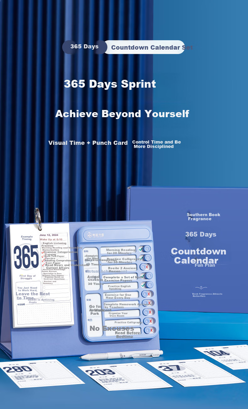 **Product Information:** Southern Fragrance 365-Day Countdown Calendar Set is a practical tool for achieving personal goals and exam success. The set includes a sturdy packaging, visual time tracking features, and a punch card system for daily progress monitoring. Ideal for exam preparation and personal growth, this calendar set is designed to help users stay disciplined and motivated throughout the year.
