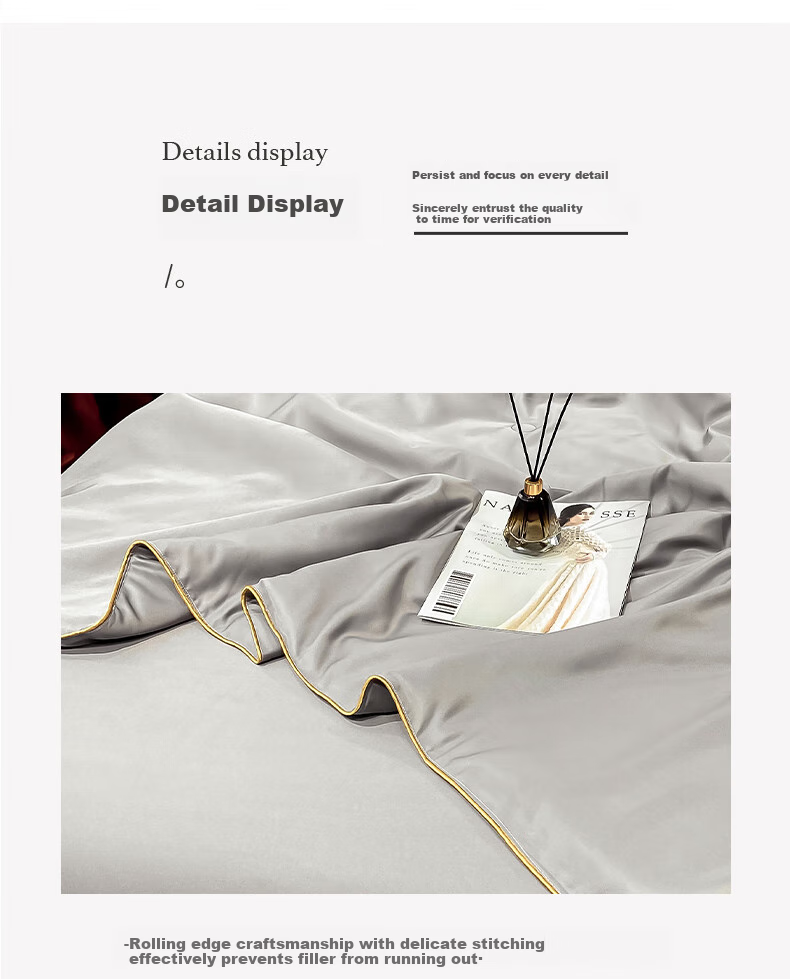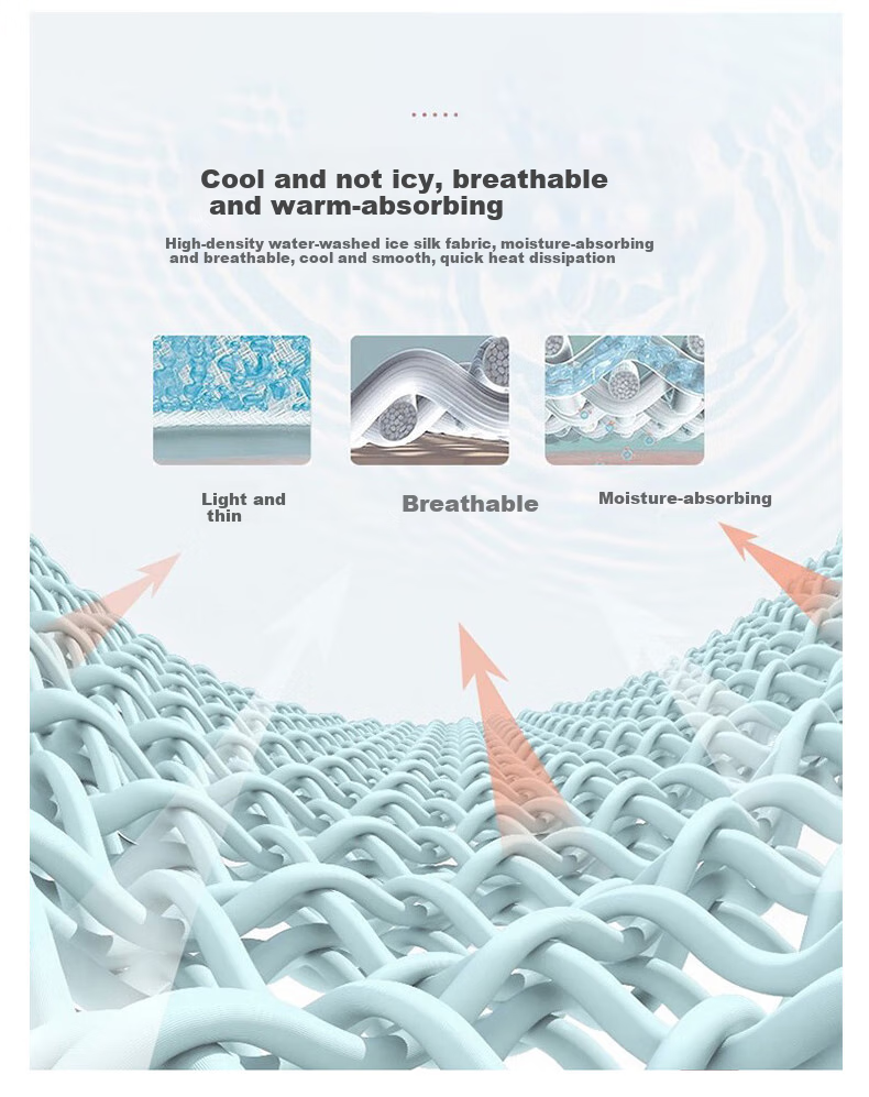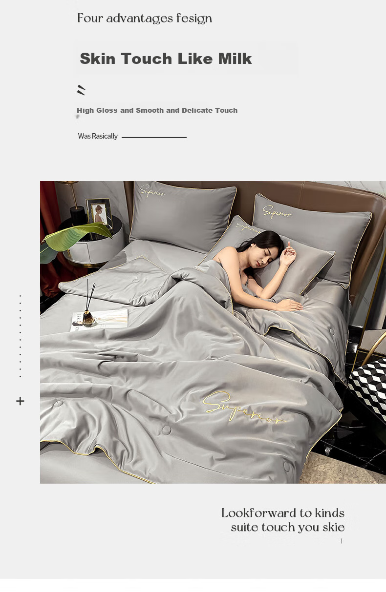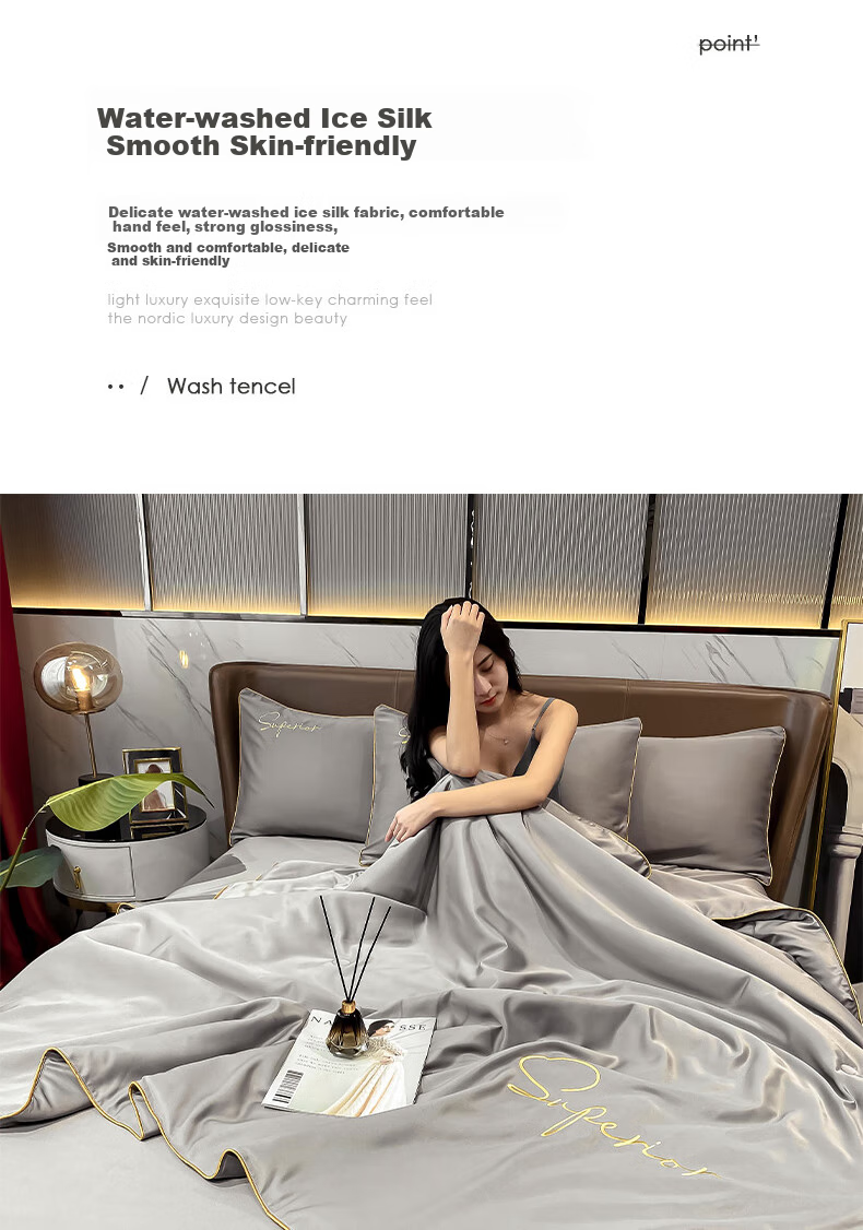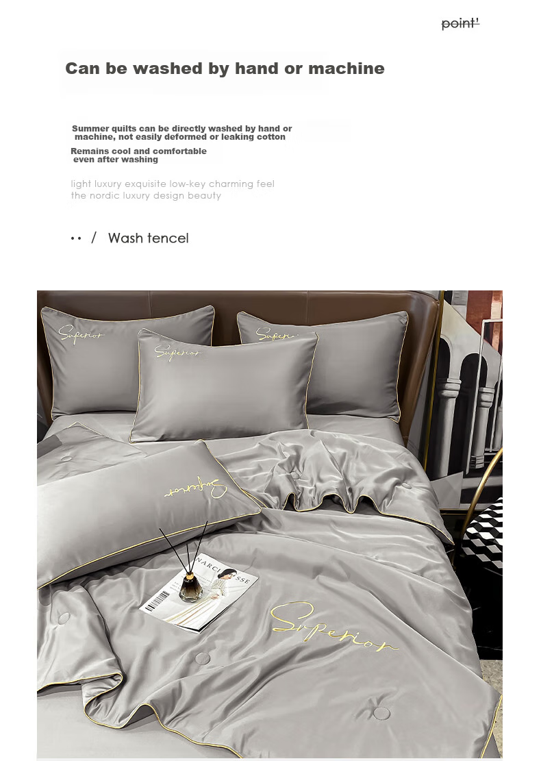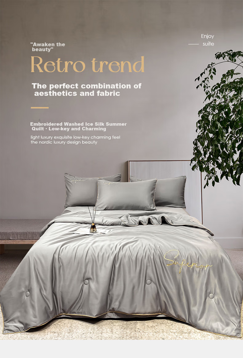 **Description:** The Delicate Washed Ice Silk Summer Quilt is subtly charming, with a light luxury exquisite low-key charming feel and Nordic luxury design beauty. It offers four design advantages, providing a skin-like touch similar to milk, high gloss, and a silky smooth texture. The ice silk fabric is smooth, skin-friendly, comfortable, and has a strong gloss. It is cool, comfortable, and durable, with a smooth luster and excellent breathability. The quilt is easy to wash, either by hand or machine, and maintains its coolness and shape even after washing. The fabric is cool, breathable, and moisture-absorbing, making it ideal for summer use.