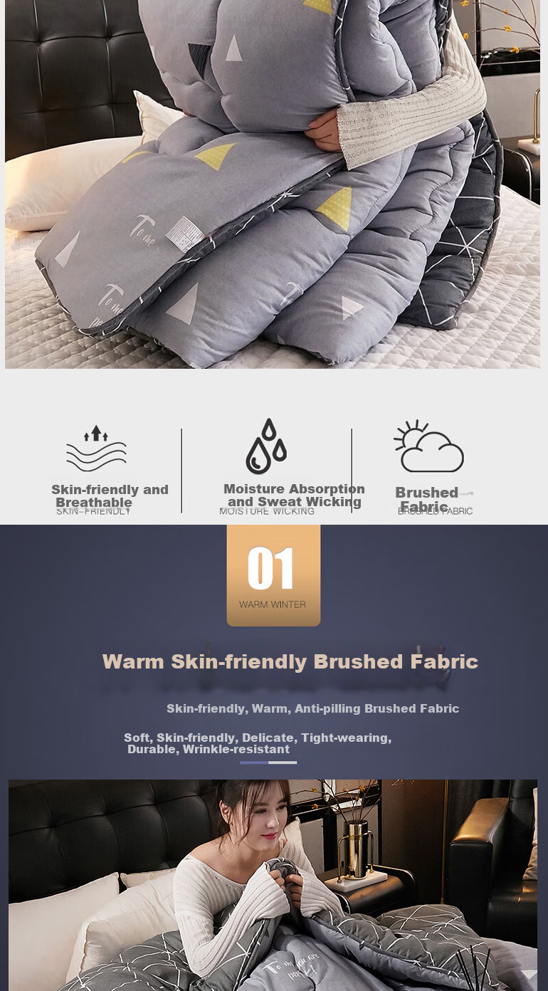 NanJiren presents "THE WARM" and "SOFT" Quilted Winter Comforter, designed to provide warmth and comfort during the cold winter months. This double-layer brushed comforter is the perfect choice for a cozy night's sleep. The high-density filling of whole feather velvet ensures a luxurious experience, while the quilting process and stitching details enhance the elegant atmosphere and texture of the comforter.