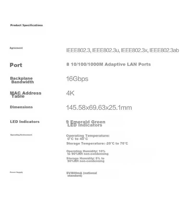 - **Ports:** 8 x 10/100/1000M adaptive LAN ports
