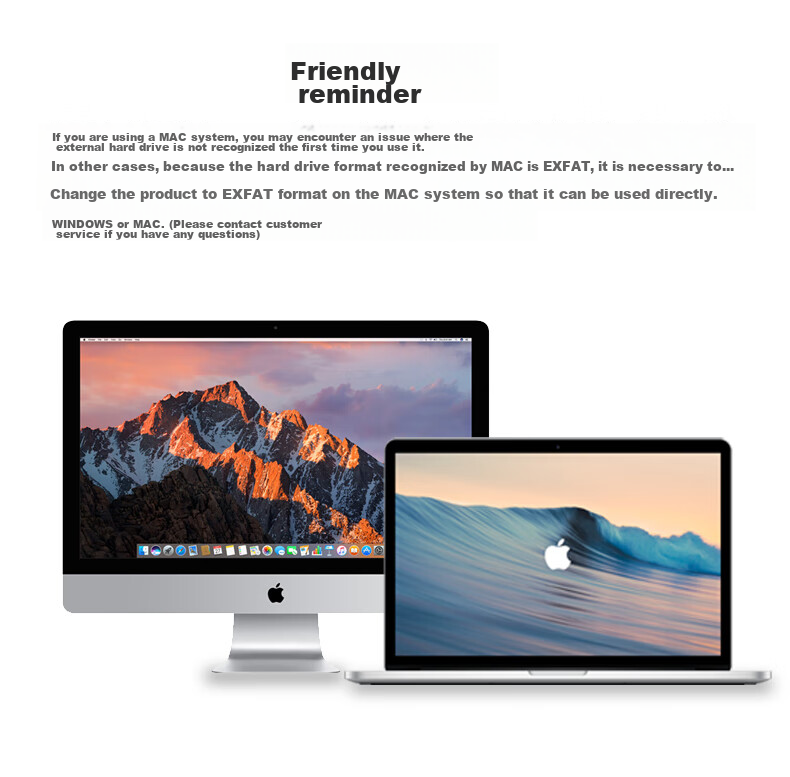 Note: For Mac users, the external hard drive may not be recognized initially due to the default EXFAT format. It is recommended to reformat the product to EXFAT for seamless use on both Windows and Mac systems. For further assistance, please contact customer service.