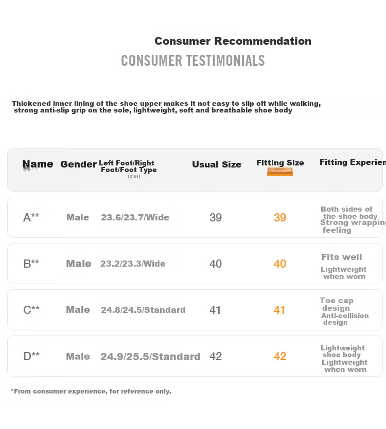 - B**: Male, 23.2/23.3/Wide, Size 40, Lightweight and comfortable fit