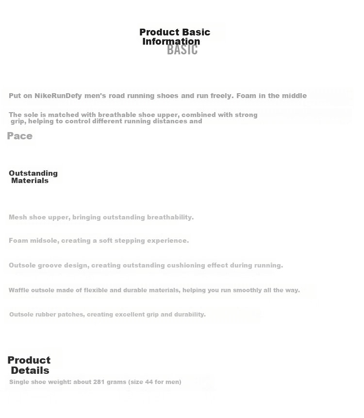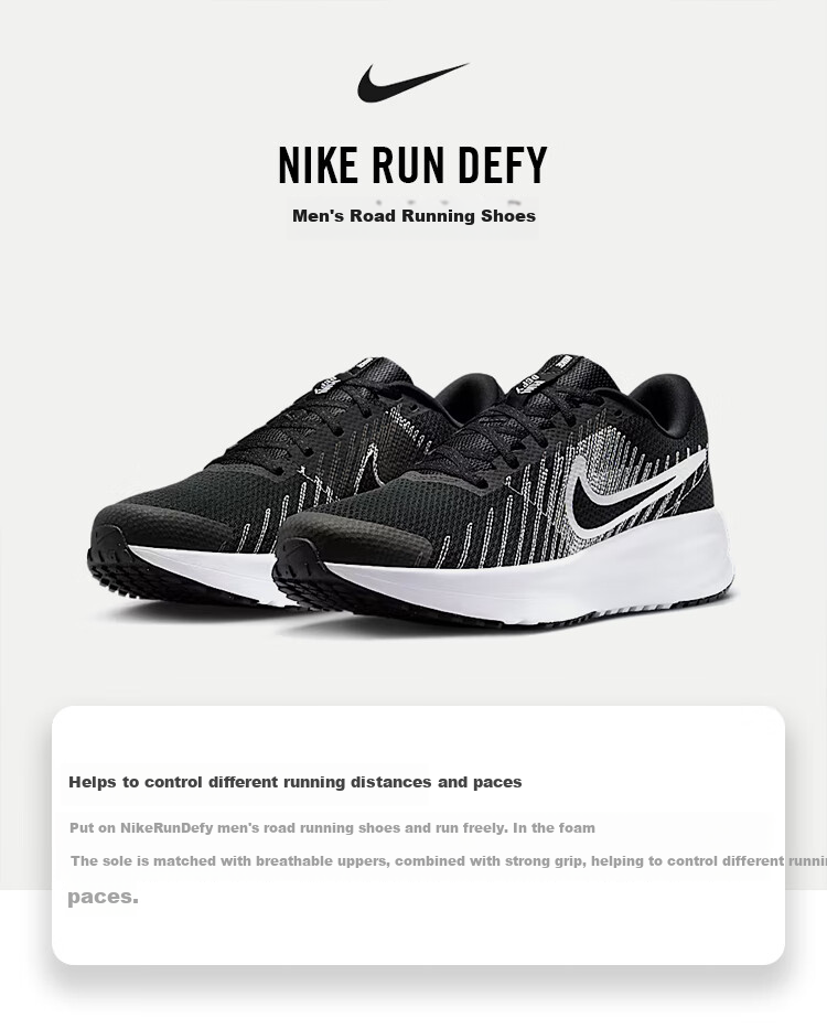 **Basic Information:** Slip on the NikeRunDefy men's road running shoes and enjoy a comfortable run. The foam midsole, breathable mesh upper, and strong traction help you control different running distances and paces.
