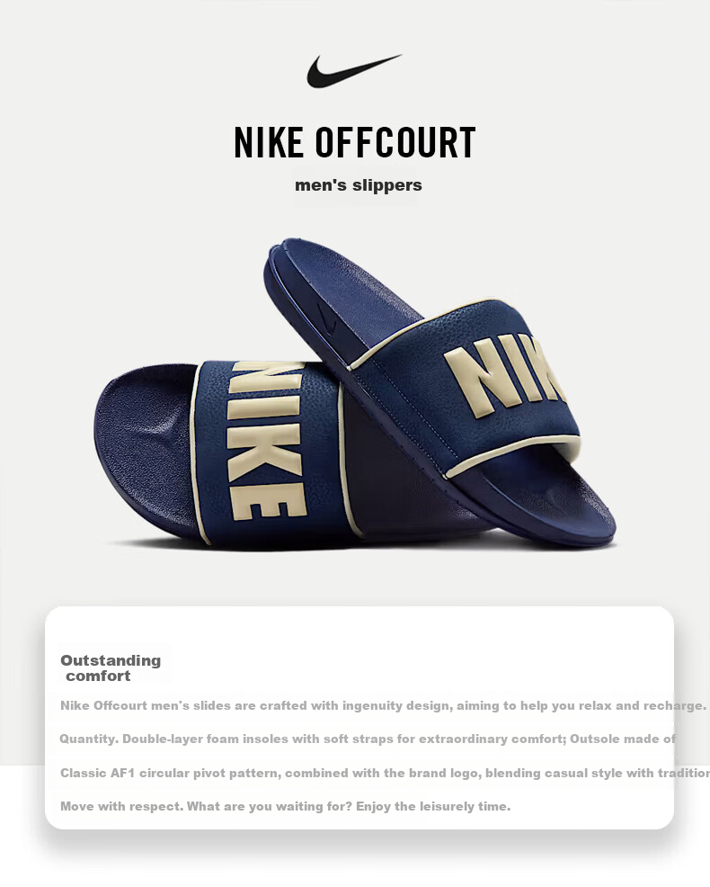 **Description:** Exceptional comfort, the NikeOffcourt Men's Slides are meticulously designed to help you relax and recharge. Featuring a dual-layer foam footbed with a soft strap for extraordinary comfort; the outsole incorporates the classic AF1 circular pivot pattern and brand logo, paying homage to traditional basketball style in a casual way. What are you waiting for? Enjoy leisurely moments.