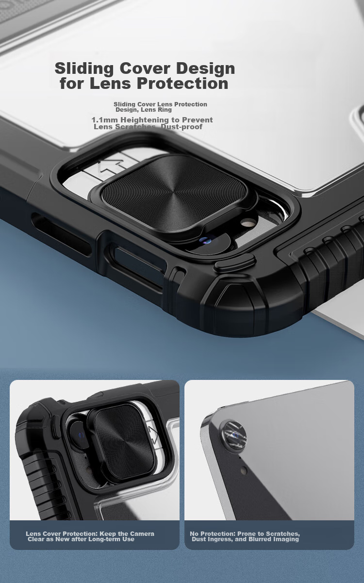 **Lens Protection:** Sliding cover design for lens protection, 1.1mm raised edge to prevent lens scratches and dust