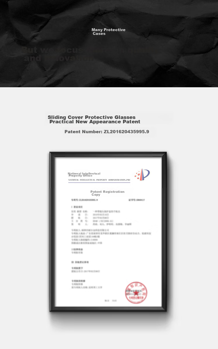 **Patent:** Innovative sliding cover lens protector with utility model appearance patent, Patent No.: ZL201620435995.9, issued by the National Intellectual Property Office
