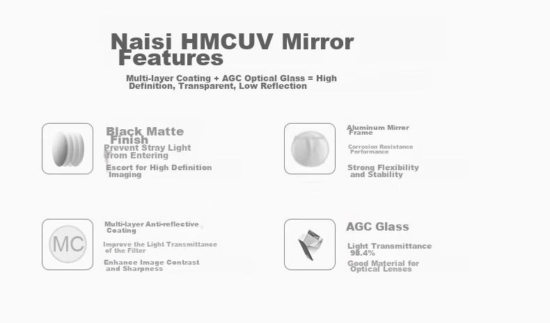 **Optical Glass:** AGC glass, multi-coated for improved light transmission and image contrast