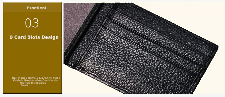 - 9 card slots design, can hold 2 vehicle registration certificates, 1 driving license, multiple membership cards