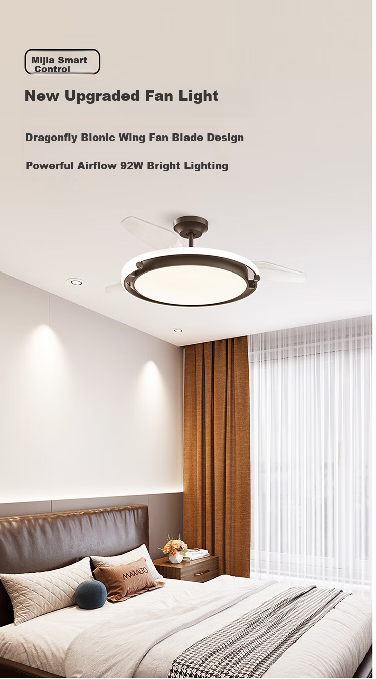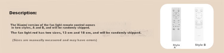 Description: The fan light Xiaomi version remote control comes in two styles: A and B, randomly shipped. The fan light suspension rod has two sizes: 13 cm and 18 cm, randomly shipped. (Sizes are manually measured and may have errors). A style, B style. Xiaomi smart control, new upgraded fan light, dragonfly biomimetic wing fan blade design, strong wind power 92 watts large lighting.