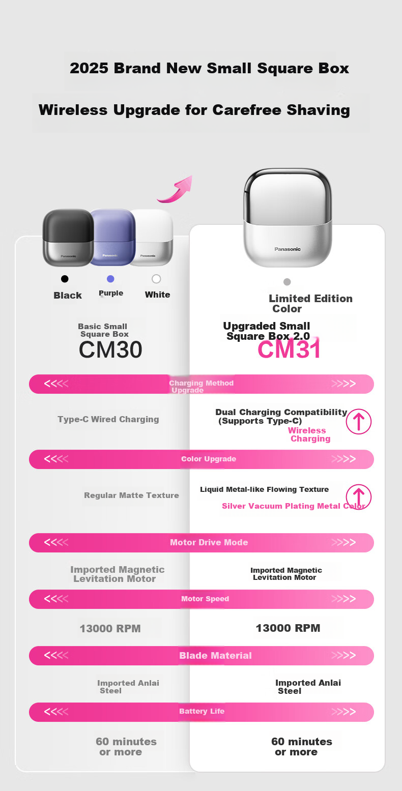 *Note: The Mini Square Box is a nickname for Panasonic ES-CM series shavers. The Magnetic Levitation Motor is a patented technology by Panasonic. The blade of ES-CM31 is imported from Japan and assembled domestically. The size of ES-CM31 remains unchanged compared to ES-CM30, with the addition of wireless charging. The shaver is designed to provide a close and comfortable shaving experience, with a focus on precision and efficiency. The LAMDASHAI Chip 7 ensures intelligent power output for different beard conditions. The shaver is designed to be waterproof for up to 30 minutes of immersion, suitable for daily use.