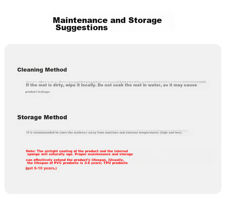 - Cleaning: Wipe the mattress with a damp cloth if dirty; do not soak or wash the mattress to prevent air leakage.