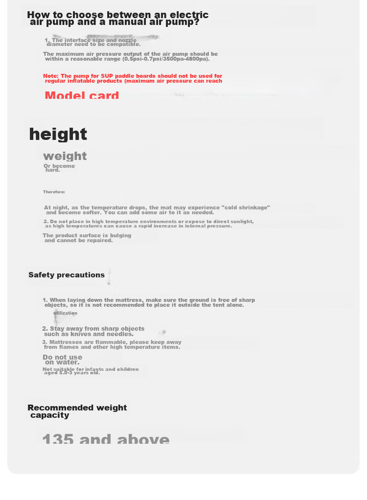 - Safety precautions include avoiding sharp objects, keeping away from flames and high temperatures, and not using the mattress on water or by infants and toddlers aged 0-3 years.