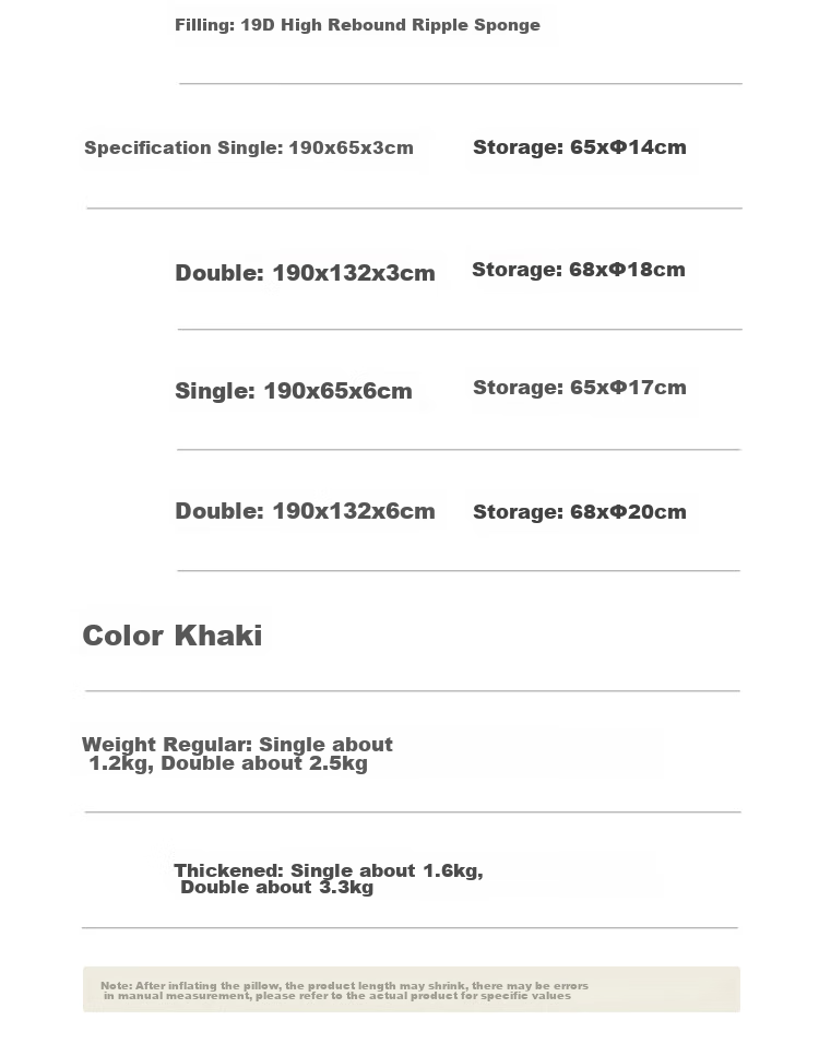 - **Specifications:** Single Size: 190x65x3cm, Double Size: 190x132x3cm, Single Size (Thickened): 190x65x6cm, Double Size (Thickened): 190x132x6cm
