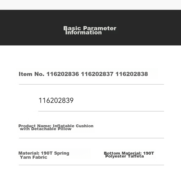 - **Material:** Surface Fabric: 190T Chun Yarn, Bottom Fabric: 190T Polyester Taffeta, Filling: 19D High Rebound Corrugated Sponge