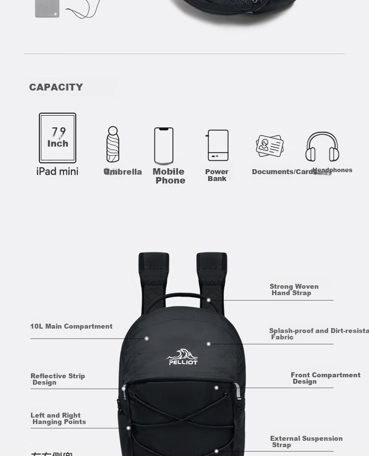 This Pelliot backpack is designed for urban commuting and outdoor hiking, featuring a 10L capacity with organized storage compartments. It is water-resistant, scratch-resistant, and lightweight for easy carrying. The backpack is equipped with high-strength Oxford fabric, ensuring durability and protection against water and dirt. With multiple functional pockets and adjustable straps, it offers convenience and comfort for various activities such as hiking, mountain climbing, and daily commuting.