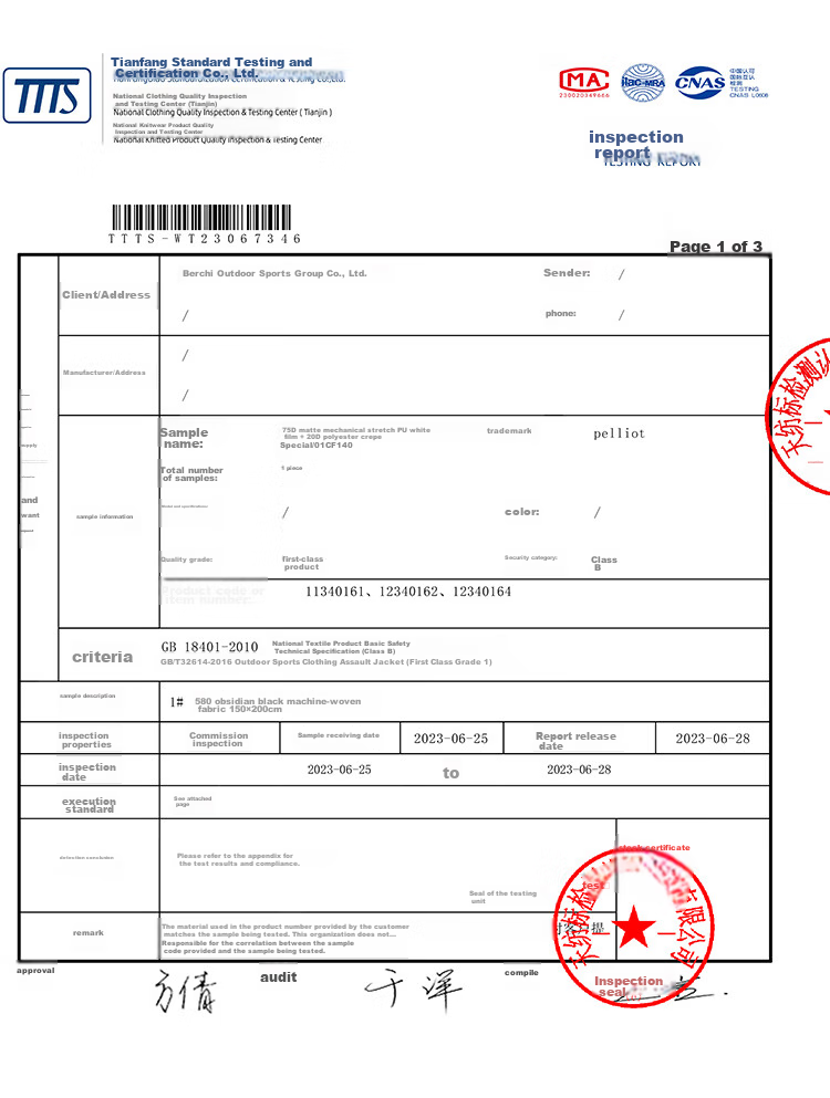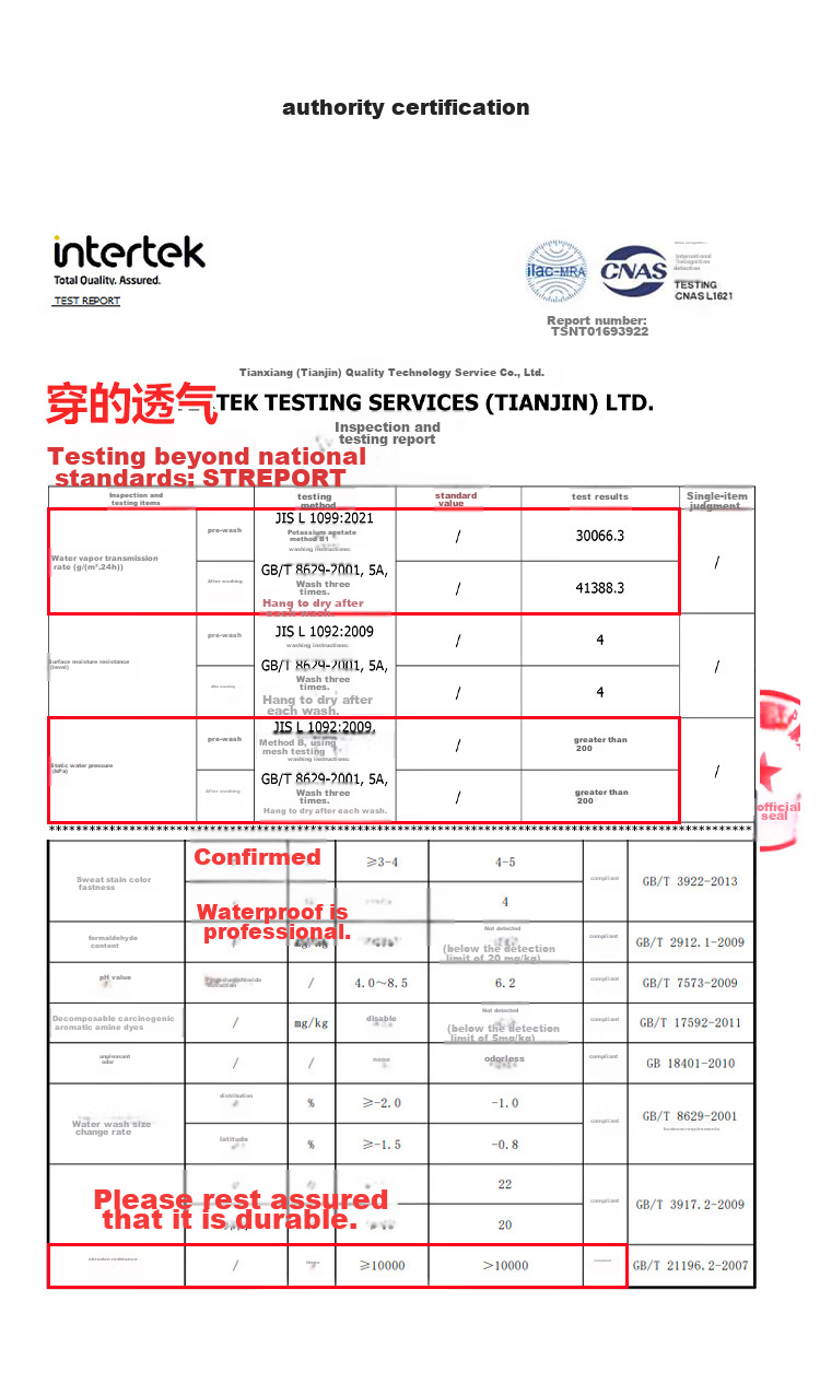 **Testing Results:** Waterproof, breathable, durable, colorfast, and safe