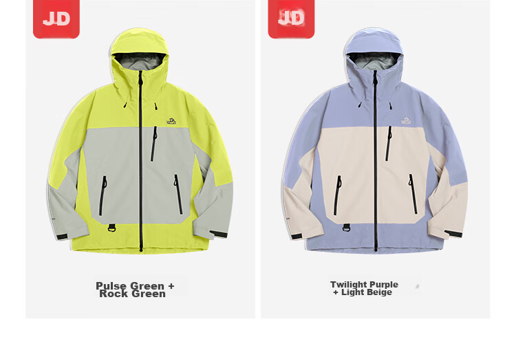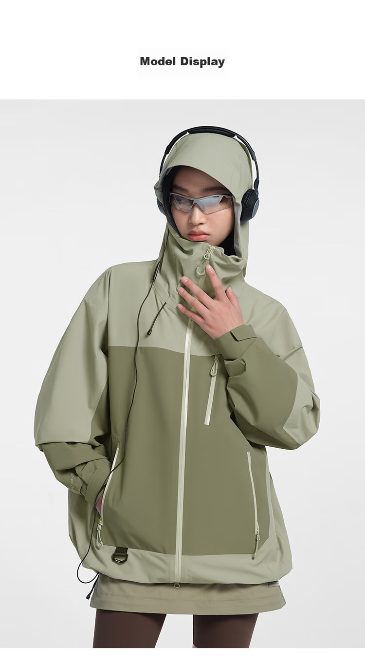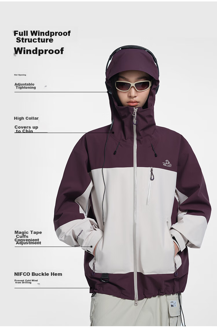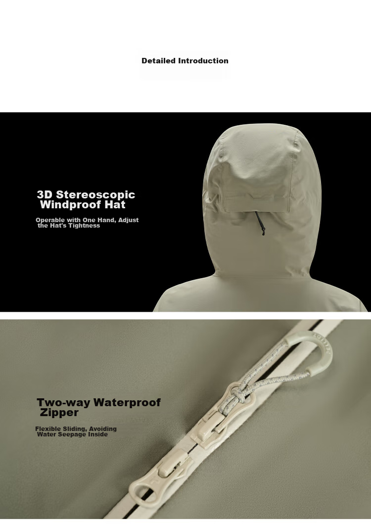 **Detail Highlights:** 3D windproof hood, dual waterproof zipper, adjustable cuffs, NIFCO buckle hem, waterproof breathable fabric