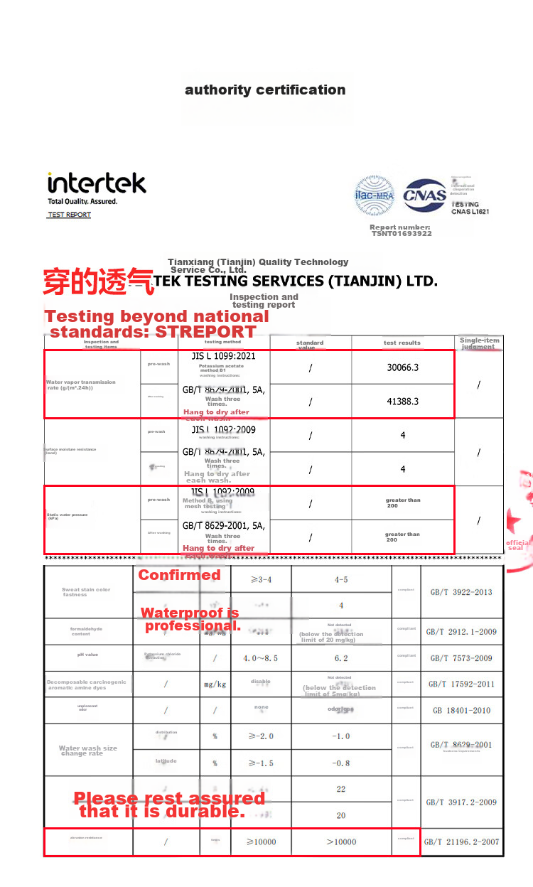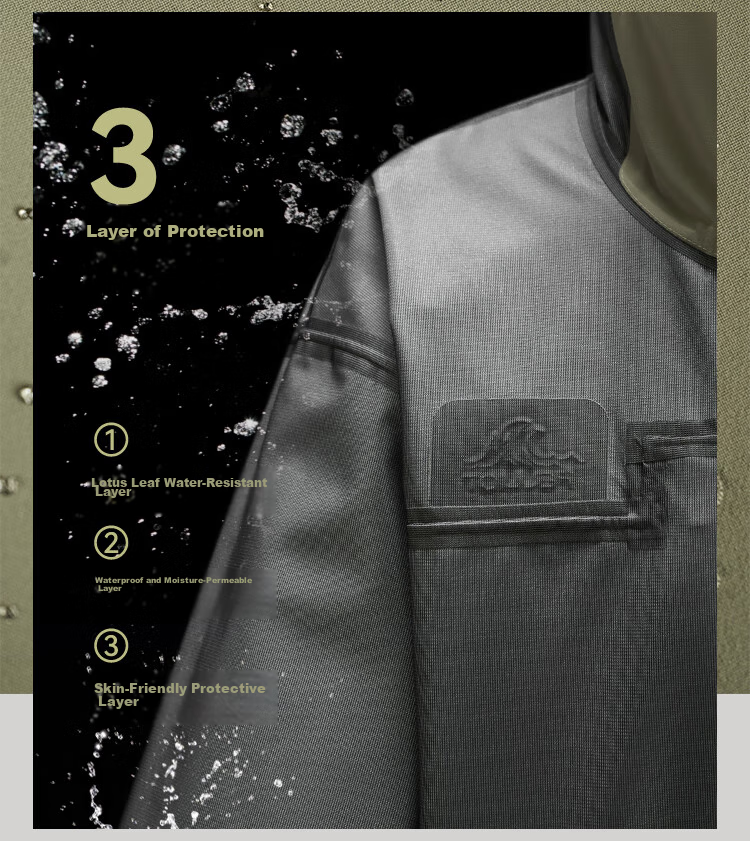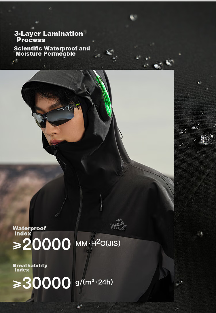 **Layered Protection:** 3-layer bonded technology with waterproof index ≥20000 MM·H2O (JIS) and breathability index ≥30000 g/(m2·24h)