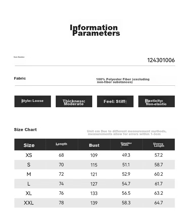 **Size Chart:** (See detailed measurements in centimeters for XS to XXL sizes)