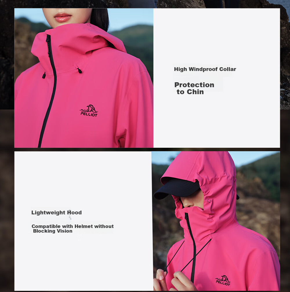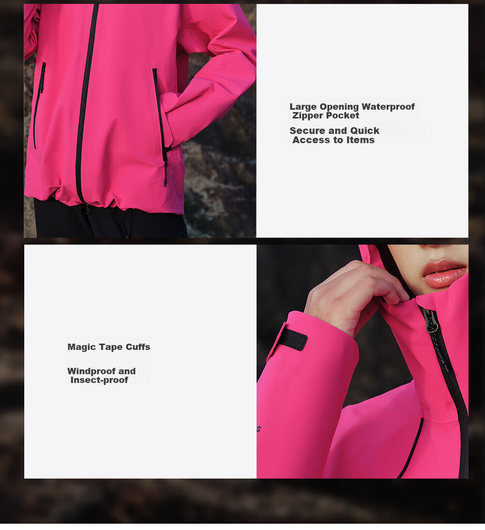 **Functionality:** Lightweight, easy to pack, high windproof collar, compatible with helmets, large waterproof zippered pockets, windproof and insect-proof cuffs