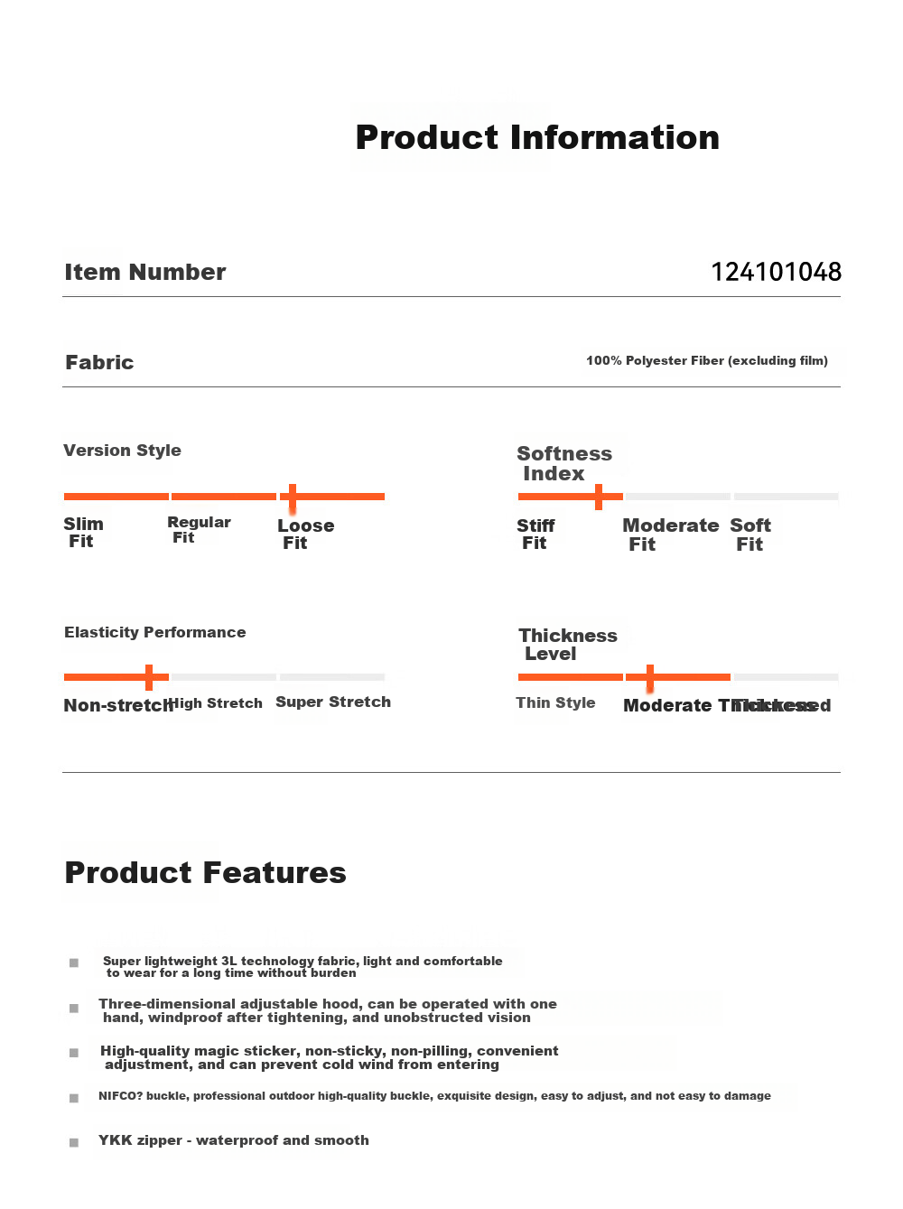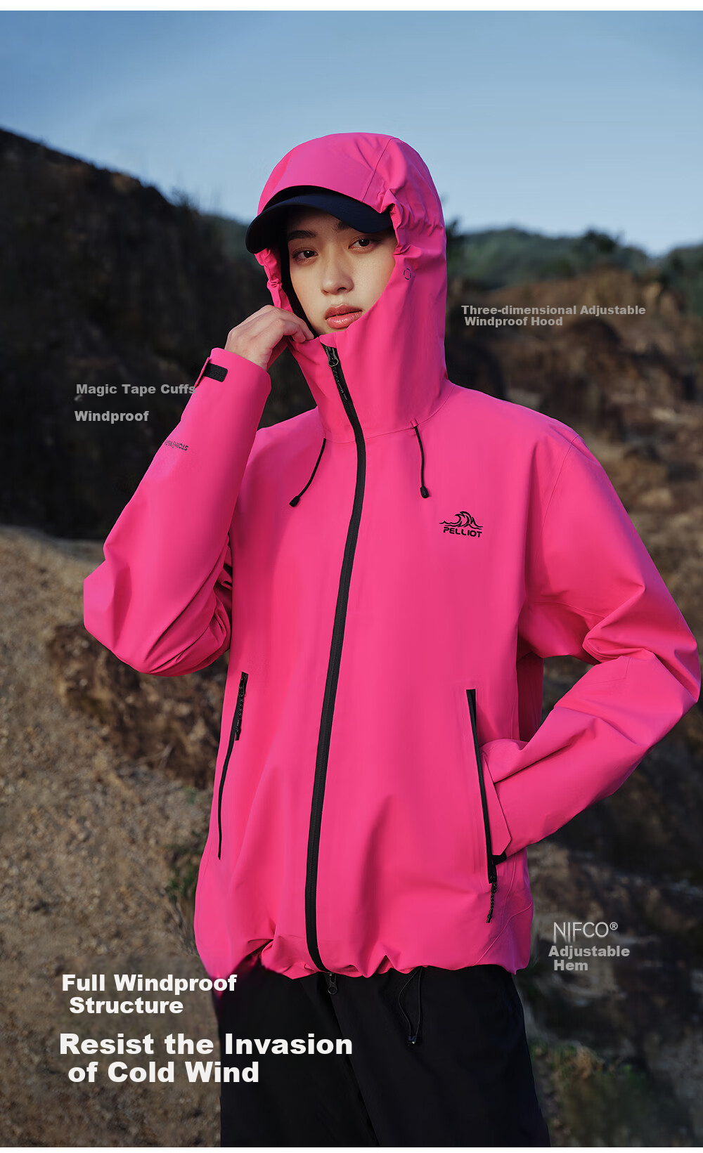 **Design:** Three-dimensional adjustable windproof hood, NIFCO? windproof cuffs, adjustable hem, full windproof structure