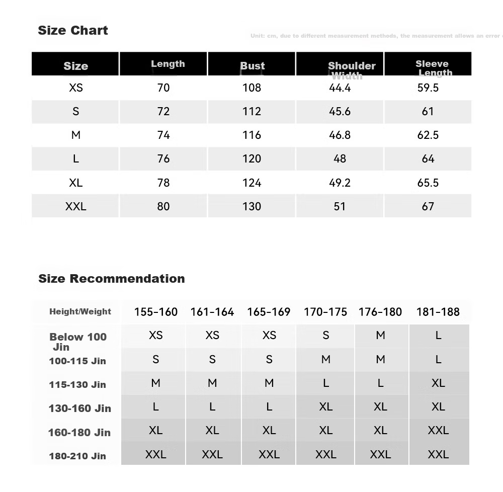 | Size | Length (cm) | Chest (cm) | Shoulder (cm) | Sleeve Length (cm) |