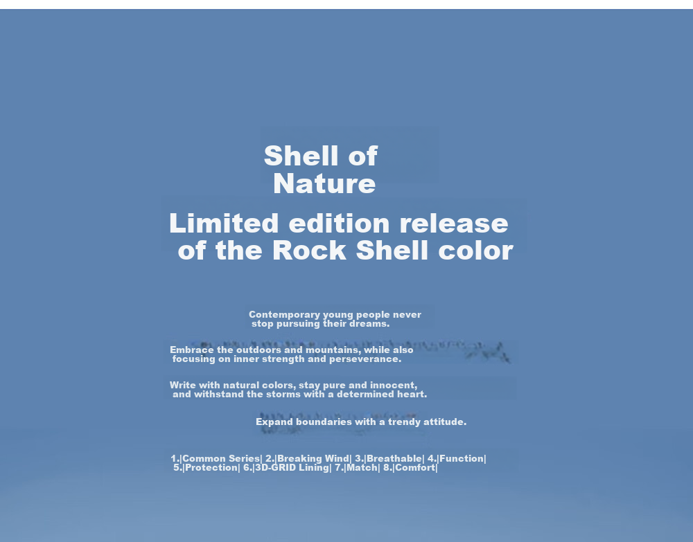 **Description:** The first hard shell for young people, embracing outdoor mountains and rivers while focusing on inner strength and breakthroughs. The natural shell series is designed for contemporary young dream chasers.