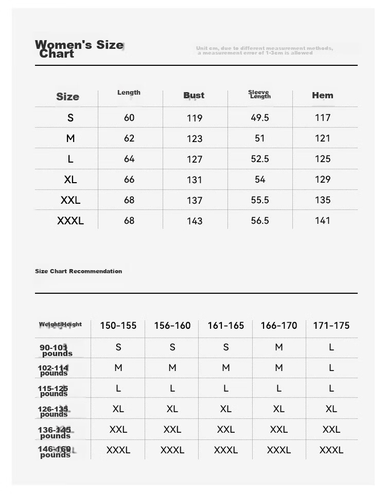 - Women's: S-XXXL (Refer to size chart for measurements)