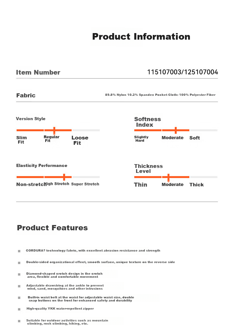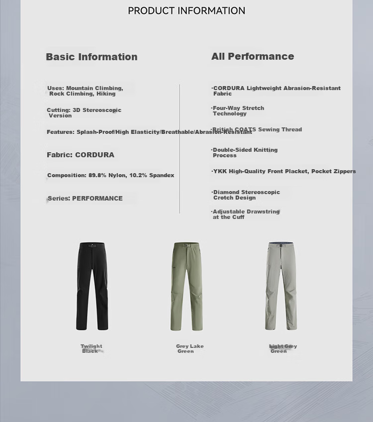 **Special Features:** CORDURA fabric, diamond crotch design, adjustable drawstring at the hem, YKK waterproof zippers, built-in waist belt, suitable for outdoor activities